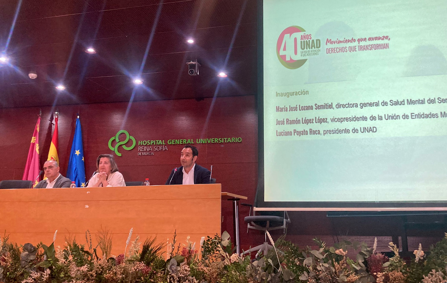 El seminario comenzó con una mesa institucional compuesta por María José Lozano, directora general de Salud Mental del Servicio Murciano de Salud; Luciano Poyato, presidente de UNAD; y José Ramón López, coordinador de Programas de Instituciones Penitenciarias y Adicciones en Fundación Diagrama y vicepresidente de la Unión de Entidades Murcianas de Atención a las Adicciones (UMAD).
