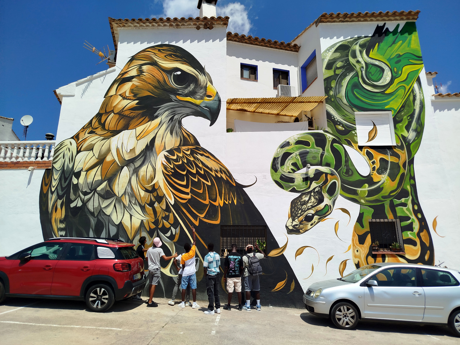 Los jóvenes del SPAAI fueron conociendo de la mano del educador que les acompañaba toda esta historia detrás del MIAU, al mismo tiempo que recorrían las calles de la localidad y se iban sorprendiendo de los numerosos murales que encontraban a cada recodo. Las obras les permitían acercarse a distintos estilos, tamaños, materiales e intereses dentro del propio grafiti, explorando de esta forma la variedad y posibilidades que ofrece este arte urbano.