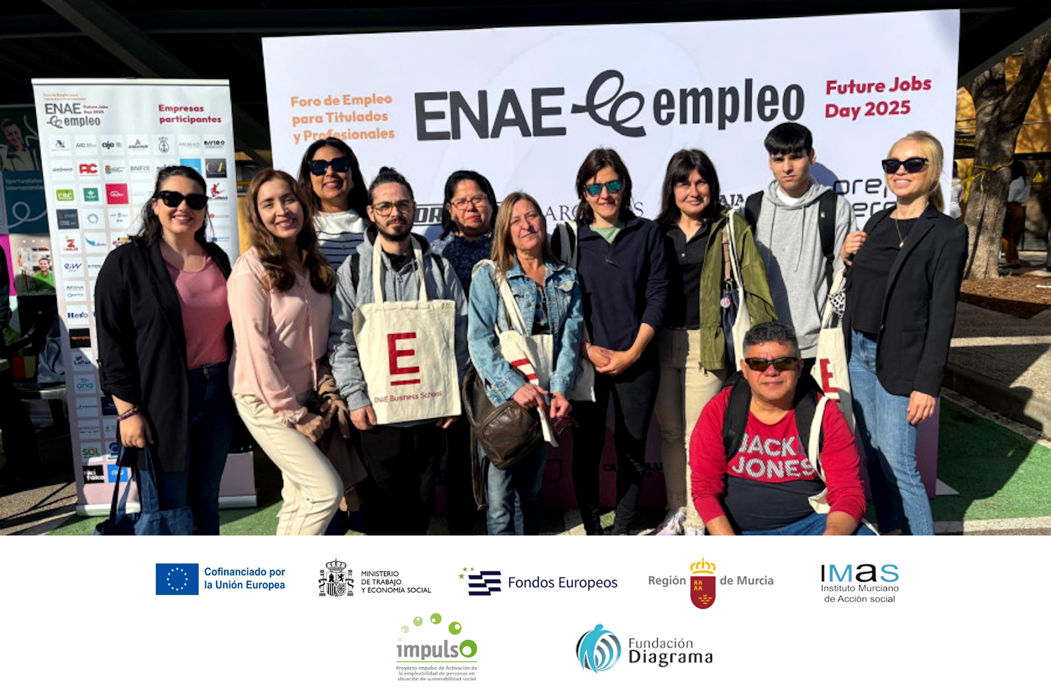 Con el objetivo de orientar, formar e integrar en acciones sociolaborales que faciliten el acceso al mercado de trabajo de las usuarias y usuarios del Proyecto Impulso de activación de la empleabilidad de personas en situación de vulnerabilidad social, un grupo de 8 participantes del programa asistieron el pasado mes de marzo al foro de empleo Future Jobs Day 2025, organizado en el Campus de Espinardo de la Universidad de Murcia por la Escuela de Negocios y de Administración de Empresas de Murcia (ENAE Business School).