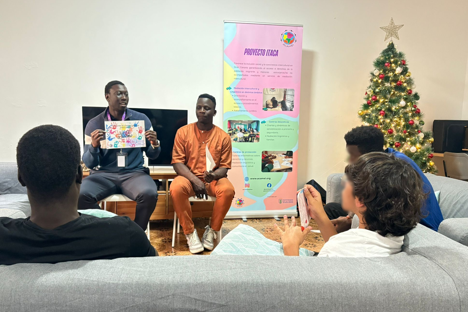 El personal educativo de este hogar de acogimiento residencial grancanario y dos mediadores interculturales y comunitarios del Proyecto Ítaca de la asociación ACAMEI ofrecieron una charla informativa y de sensibilización a las siete personas jóvenes del centro donde les dieron a conocer sus derechos y deberes, los recursos educativos, sanitarios, sociales y comunitarios a su alcance y los trámites administrativos vinculados a ellos y ellas.
