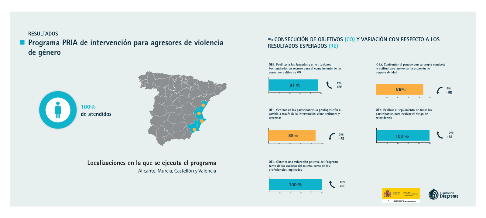 Durante el año 2023, Fundación Diagrama ha intervenido a través del Programa PRIA con un total de 99 hombres penados por violencia de género, y que han sido derivados por la Secretaría General de Instituciones Penitenciarias de los centros penitenciarios de Murcia, Alicante, Castellón y Valencia. El PRIA ha sido financiado por el Ministerio de Derechos Sociales, Consumo y Agenda 2030 con cargo a la asignación tributaria del IRPF.