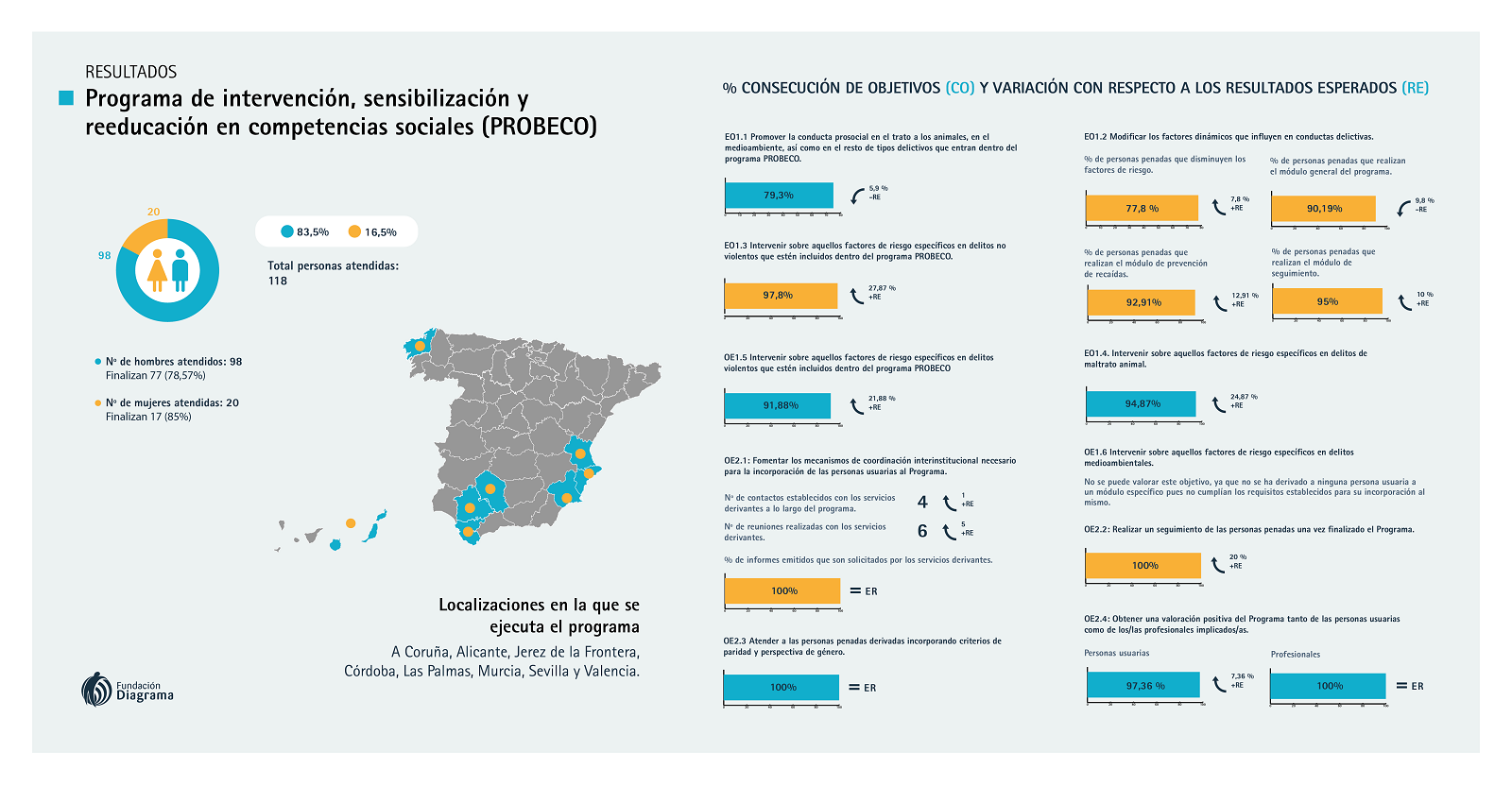 La labor llevada a cabo por el equipo de Fundación Diagrama en el Programa de Intervención, Sensibilización y Reeducación en Competencias Sociales (PROBECO) a lo largo del año 2022 se ha saldado con éxito en la mayoría de los indicadores de resultados registrados. Este proyecto, financiado por el Ministerio de Derechos Sociales y Agenda 2030 a través de la convocatoria de subvenciones con fines de interés social con cargo a la asignación tributaria del IRPF, ha permitido atender a un total de 118 personas derivadas por los Centros de Inserción Social ‘Alfredo Jorge Suar Muro’ (Jerez de la Frontera), ‘Carlos García Valdés’ (Córdoba), ‘Carmela Arias y Díaz de Rabago’ (A Coruña) y ‘Guillermo Miranda’ (Murcia), los centros penitenciarios ‘Sevilla II’ (Morón de la Frontera) y ‘Las Palmas II’ (Las Palmas de Gran Canaria) y los Servicios de Gestión de Penas y Medidas Alternativas de Valencia y Alicante.