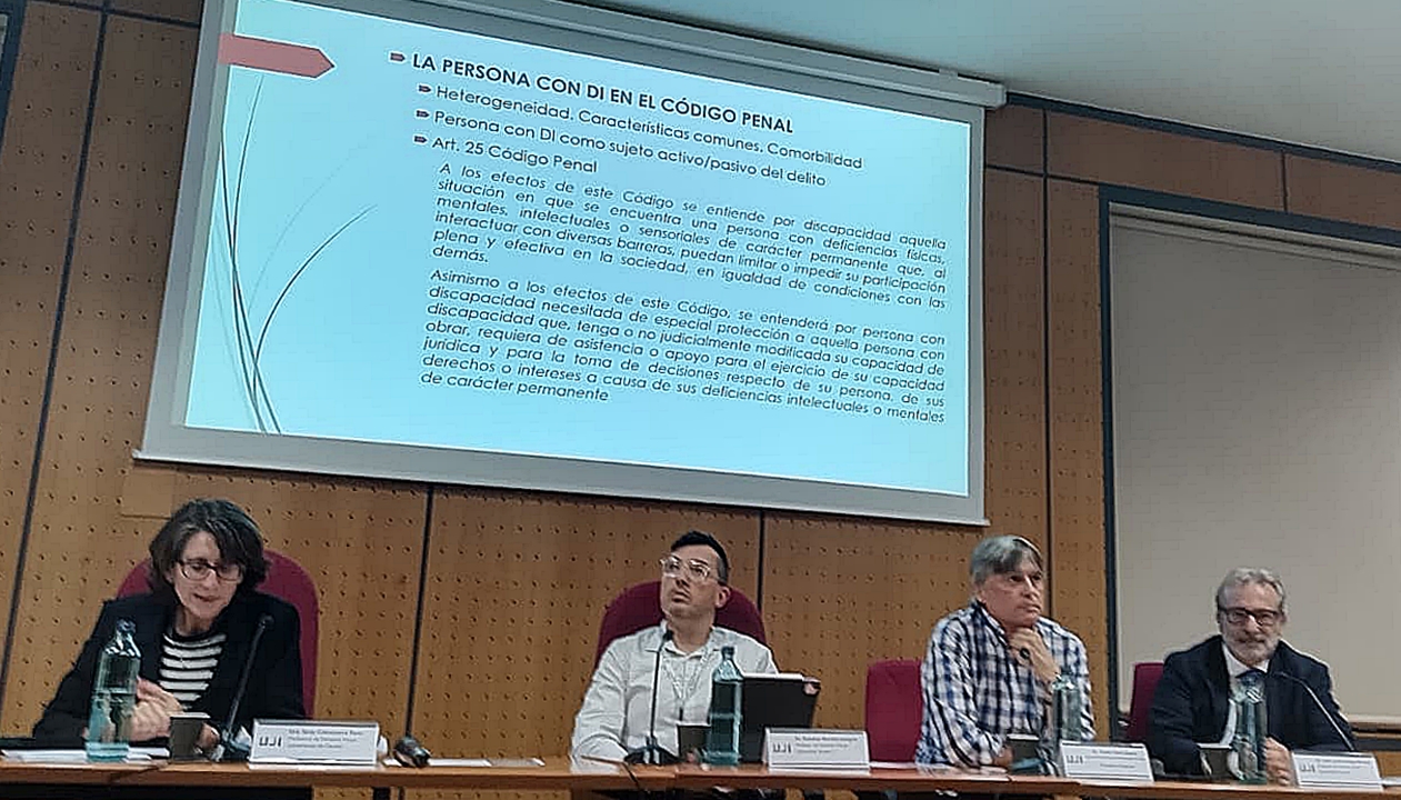 Víctor Carratalá, profesor de Derecho Penal en la UJI, moderó la primera mesa de debate del Congreso. Junto a Rubén Simó, participaron en ella Itziar Casanueva, profesora de Derecho Público en la Universidad de Deusto, que centró su intervención en ‘Discapacidad y responsabilidad penal’; y Juan José Periago, vicedecano de la Facultad de Ciencias Humanas y Sociales de la UJI, que habló sobre ‘El internamiento terapéutico de menores discapacitados infractores’.