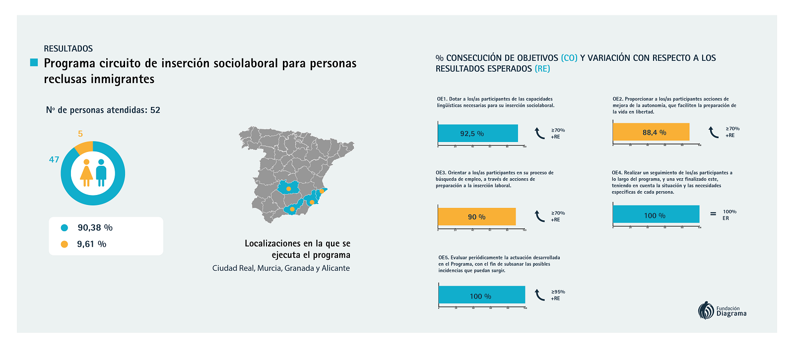 A lo largo del año 2022, un total de 52 personas con una pena privativa de libertad han participado en el Circuito de Inserción Sociolaboral para Personas Reclusas Migrantes. Este programa, desarrollado por Fundación Diagrama en las provincias de Ciudad Real, Murcia, Granada y Alicante, ha sido financiado por el Ministerio de Derechos Sociales y Agenda 2030 a través de la convocatoria de subvenciones para la realización de actividades de interés general consideradas de interés social, desarrolladas por entidades del Tercer Sector de Acción Social, con cargo a la asignación tributaria del Impuesto sobre la Renta de las Personas Físicas.