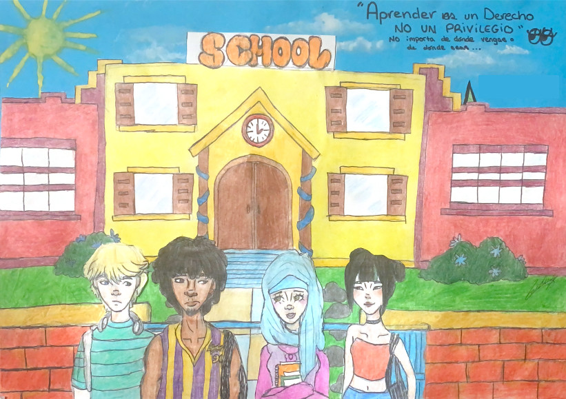 - 1er PREMIO: ‘DERECHOS’. El jurado valoró el manejo de la técnica, el color y la composición, dando lugar a una imagen muy atractiva, que invita a reflexionar sobre la importancia de una educación inclusiva para todas las personas.